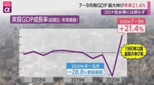 国内最新のGDP速報値では、前回の落ち込みが大きかったので、急激なV字回復をしたように見えるが、落ち込み分までは回復しておらず、全体的にはマイナス成長となる。