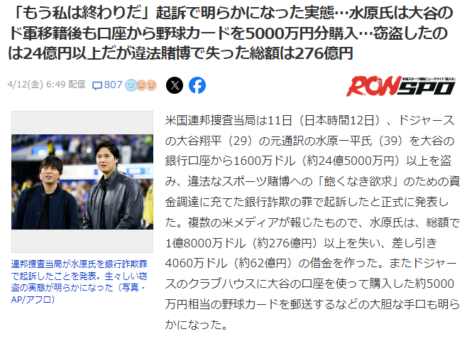 アメリカの連邦検事が事件の詳細を説明し、大谷選手の元通訳の水原一平氏を訴追した。大谷選手は違法賭博に一切関与しておらず、完全なる「被害者」と結論を出した。